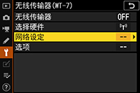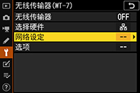 在照相机设定菜单中选择无线传输器(WT-7)>网络设定。