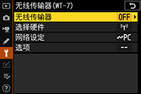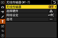 加亮显示无线局域网,然后向右按下多重选择器返回无线传输器(WT-7)菜单。