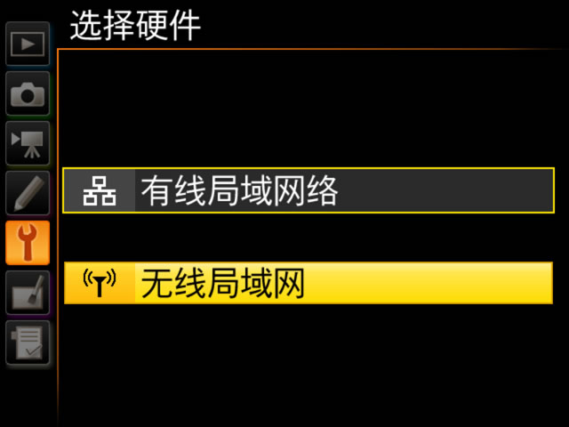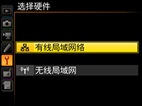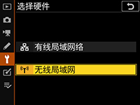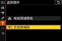 在照相机设定菜单中选择有线LAN/WT>选择硬件>无线局域网。