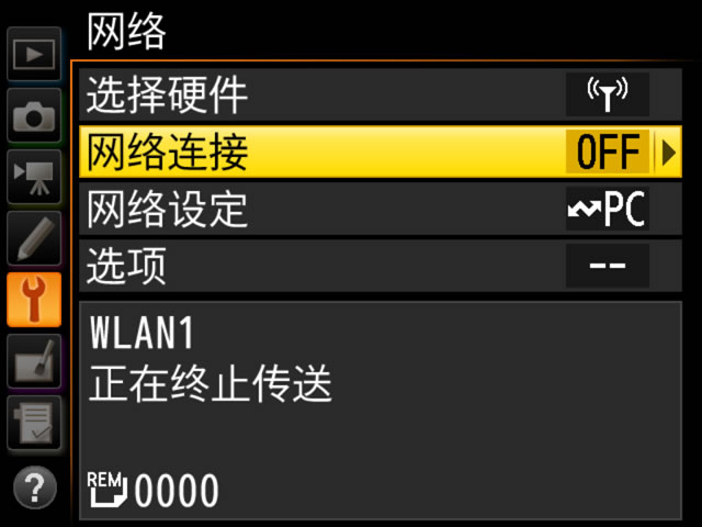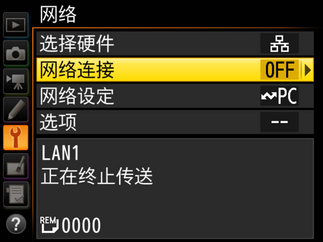 - Z9:在照相机网络菜单中将有线局域网络选为OFF。