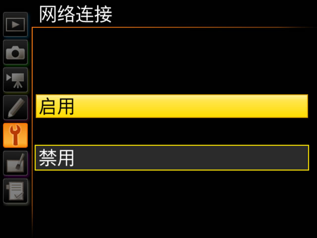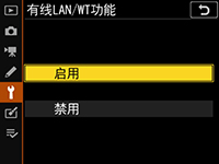 在照相机设定菜单中将有线LAN/WT>有线LAN/WT功能选为启用。