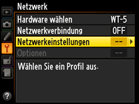 Wählen Sie im Kamera-Systemmenü Netzwerk > Netzwerkeinstellungen und befolgen Sie die Bildschirmanweisungen, um ein Netzwerkprofil zu erstellen. Das Erstellen von Ethernet-Profilen ist in der Netzwerkübersicht zur Kamera erläutert. Informationen zur Verwendung des WT-7 oder WT-5 finden Sie in der zum Gerät gehörenden Dokumentation.