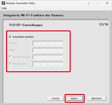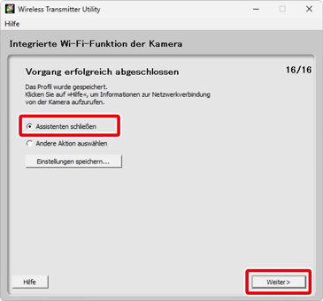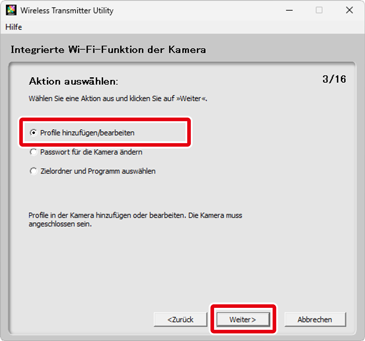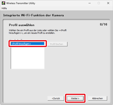 Das Wireless Transmitter Utility kann Netzwerkprofile nur für FTP-Upload erstellen. Verwenden Sie die Kamera, um Profile für Bildübertragung und Camera Control zu erzeugen.
