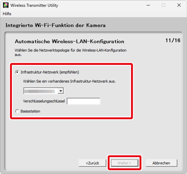 Wenn Sie in Schritt 7 Automatisches Setup (empfohlen) wählen, werden die Wireless-LAN-Einstellungen automatisch vorgenommen. Wählen Sie Infrastruktur-Netzwerk (empfohlen) oder Basisstation und klicken Sie auf Weiter, um mit Schritt 10 fortzufahren.