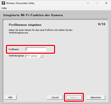 Geben Sie einen aus bis zu 16 Zeichen bestehenden Profilnamen ein und klicken Sie auf Weiter. Es lassen sich nur Profile für FTP-Upload erstellen; andere Verbindungstypen sind nicht verfügbar.