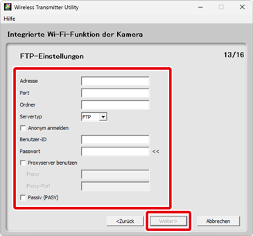 Wählen Sie die FTP-Servereinstellungen und klicken Sie auf Weiter. Nähere Angaben finden Sie in der folgenden Tabelle.