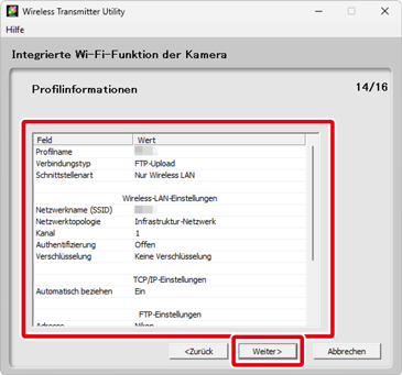 Zum Bearbeiten eines vorhandenen Netzwerkprofils müssen Sie es auswählen und auf Weiter klicken. Um ein vorhandenes Netzwerkprofil zu löschen, müssen Sie es auswählen und auf Profil löschen klicken. Das Wireless Transmitter Utility kann nicht zur Änderung der Profile verwendet werden, die mit der Kameraoption Passwortschutz geschützt wurden. Wählen Sie Aus für den Passwortschutz, bevor Sie die Profile löschen oder verändern.