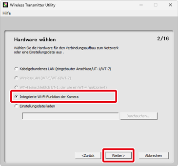 Wählen Sie Integrierte Wi-Fi-Funktion der Kamera aus und klicken Sie auf Weiter.