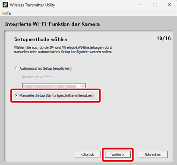 Wählen Sie Manuelles Setup (für fortgeschrittene Benutzer) aus und klicken Sie auf Weiter.