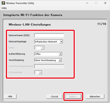 Wenn Sie Infrastruktur-Netzwerk (empfohlen) ausgewählt haben, wählen Sie die Netzwerkeinstellungen, die Sie zur Herstellung der Verbindung verwenden werden, aus dem Pull-down-Menü aus und geben Sie einen Verschlüsselungsschlüssel ein. Mac-Nutzer können die Verschlüsselung und den Schlüsselindex aus den Pull-down-Menüs wählen.