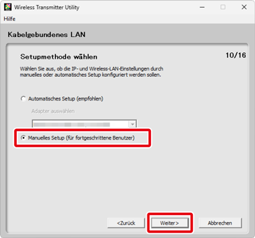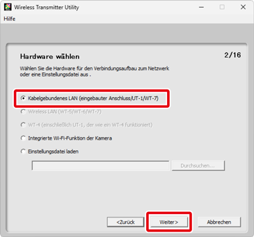 Wählen Sie Kabelgebundenes LAN (eingebauter Anschluss/UT-1/WT-7) aus und klicken Sie auf Weiter.