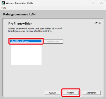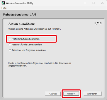 Zum Bearbeiten eines vorhandenen Netzwerkprofils müssen Sie es auswählen und auf Weiter klicken. Um ein vorhandenes Netzwerkprofil zu löschen, müssen Sie es auswählen und auf Profil löschen klicken. Das Wireless Transmitter Utility kann nicht zur Änderung von Profilen verwendet werden, die mit der Kameraoption Passwortschutz geschützt wurden. Wählen Sie Aus für den Passwortschutz, bevor Sie die Profile löschen oder verändern.