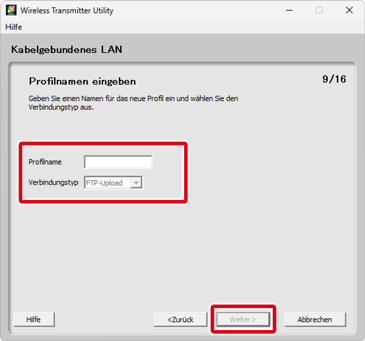 Geben Sie einen aus bis zu 16 Zeichen bestehenden Profilnamen ein und wählen Sie den Verbindungstyp FTP-Upload, Bildübertragung, Camera Control oder HTTP-Server. Klicken Sie auf Weiter, wenn die Einstellungen vollständig sind.