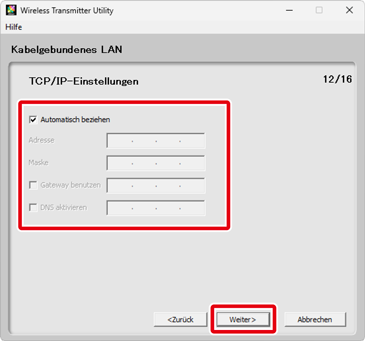 Wenn Sie in Schritt 7 Automatisches Setup (empfohlen) wählen, werden die TCP/IP-Einstellungen automatisch vorgenommen. Gehen Sie zu Schritt 9. Beachten Sie, dass Automatisches Setup (empfohlen) in folgenden Fällen nicht verfügbar ist: