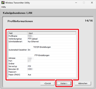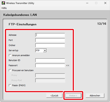 Die FTP-Server-Einstellungen stehen nur zur Verfügung, wenn FTP-Upload bei Schritt 6 gewählt wurde. Fahren Sie mit Schritt 10 fort, wenn eine andere Option gewählt ist. Klicken Sie nach dem Vornehmen der Einstellungen auf Weiter. Nähere Angaben finden Sie in der folgenden Tabelle.