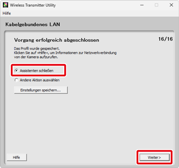 Die Ethernet-Einrichtung (kabelgebundenes LAN) ist nun abgeschlossen. Informationen für eine Verbindung mit dem Netzwerk von der Kamera aus finden Sie unter »Verbinden mithilfe von Profilen, die per Computer erstellt wurden«.