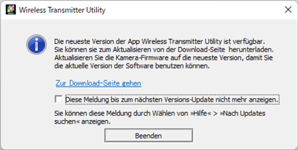 Abhängig vom Kameramodell müssen Sie möglicherweise nicht nur Connection Profile, sondern auch Wireless Transmitter Utility aktualisieren. In diesem Fall wird beim Programmstart ein Benachrichtigungsdialog angezeigt. Sie können den Benachrichtigungsdialog auch über die Option Nach Updates suchen im Menü Hilfe aufrufen.