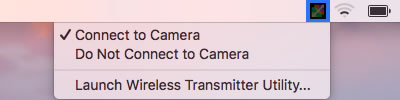- When the Wireless Transmitter Utility is installed, the Wireless Transmitter Utility icon in the menu bar can be used to end the connection to the camera or launch the Wireless Transmitter Utility. The following are available only when Image transfer is selected as the operation mode: