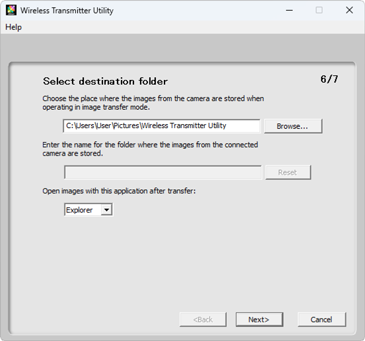 To choose a sub-folder for pictures downloaded from the camera, close the window, connect the camera and computer via USB, and then relaunch the Wireless Transmitter Utility. When prompted to choose hardware, select Camera’s built-in Wi-Fi, click Next, and select Select destination folder and application in the action dialog. Clicking Next will then take you to a dialog where you can select a sub-folder under the destination folder.