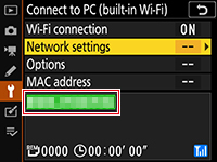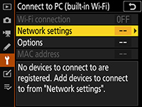 - D6: Setup menu > Connect to PC (built-in Wi-Fi) > Network settings