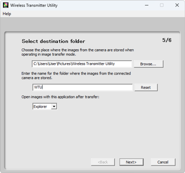 To choose a sub-folder for pictures downloaded from the camera, close the window, connect the camera and computer via USB, and then relaunch the Wireless Transmitter Utility. When prompted to choose hardware, select Wired LAN (built-in port/UT-1/WT-7), click Next, and select Select destination folder and application in the action dialog. Clicking Next will then take you to a dialog where you can select a sub-folder under the destination folder.