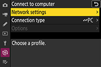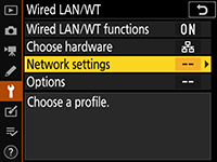 Select Wired LAN/WT > Network settings in the camera setup menu and follow the on-screen instructions to create a network profile. For information on creating Ethernet profiles, see the camera Reference Manual. For information on using the WT-6, see the camera Reference Manual or the manual for the WT-6.