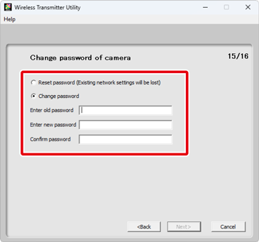 Selecting Change password of camera before clicking Next in Step 4 displays a password-entry dialog. Entering a password in this dialog will cause the Wireless Transmitter Utility to display a password prompt when the camera is connected to other computers. Once the correct password has been entered, the prompt will not be displayed again.