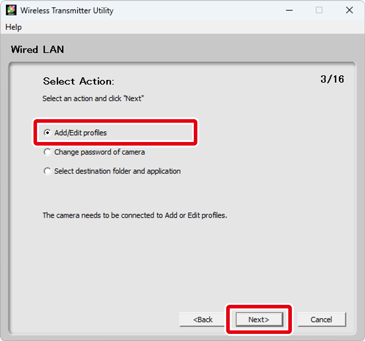To edit an existing network profile, select it and click Next. To delete an existing profile, select it and click Delete profile. The Wireless Transmitter Utility cannot be used to alter profiles that have been protected using the camera Password protection option. Choose Off for Password protection before deleting or modifying profiles.