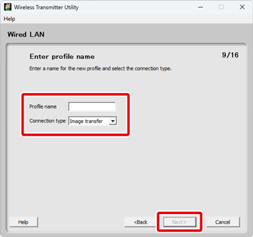 Enter a profile name of up to 16 characters and choose a connection type from FTP upload, Image transfer, Camera control, or HTTP server. Click Next when settings are complete.