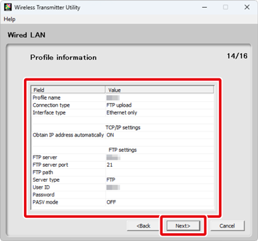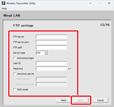 FTP server settings will only be available if FTP upload is selected in Step 6. Proceed to Step 10 if another option is selected. After adjusting settings, click Next. For more information, refer to the table below.