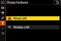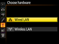 Select Wireless transmitter (WT-7) > Choose hardware > Wired LAN in the camera setup menu.