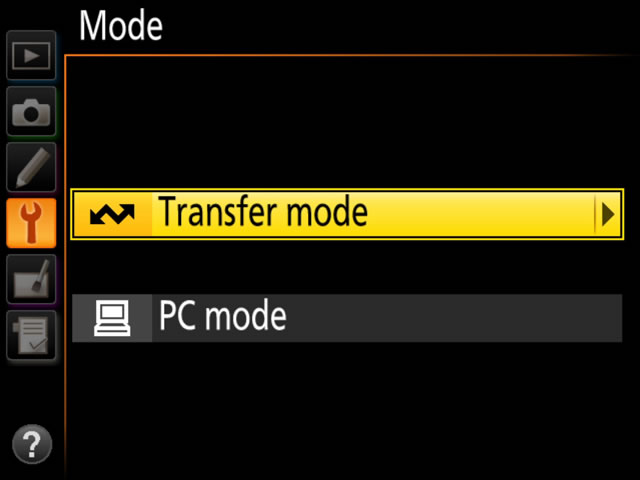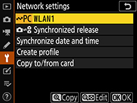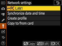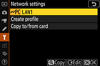 Choose from Transfer mode and PC mode. Pressing the multi selector right displays a list of network profiles.