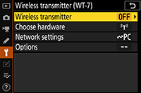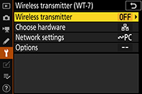 Select Wireless transmitter (WT-7) > Choose hardware > Wireless LAN in the camera setup menu.