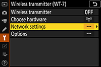 Select Wireless transmitter (WT-7) > Network settings in the camera setup menu.