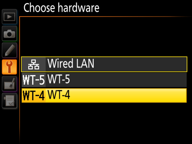Select Network > Choose hardware > WT-4 in the camera setup menu.