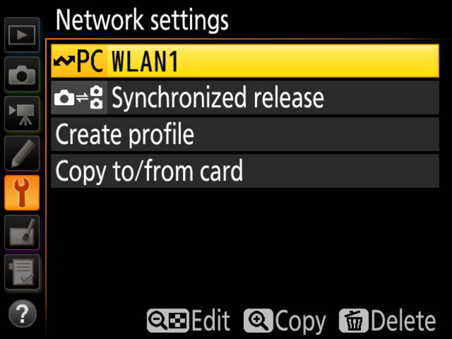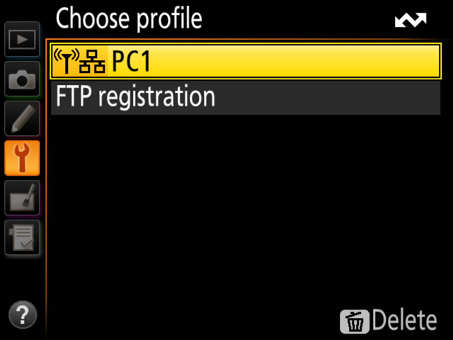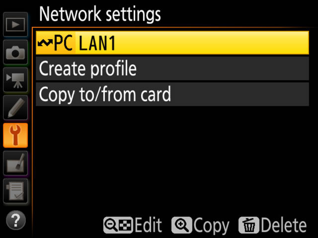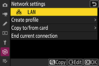 Highlight a profile and press the multi selector right to return to the Wired LAN/WT menu. Wait for the camera to establish the connection.