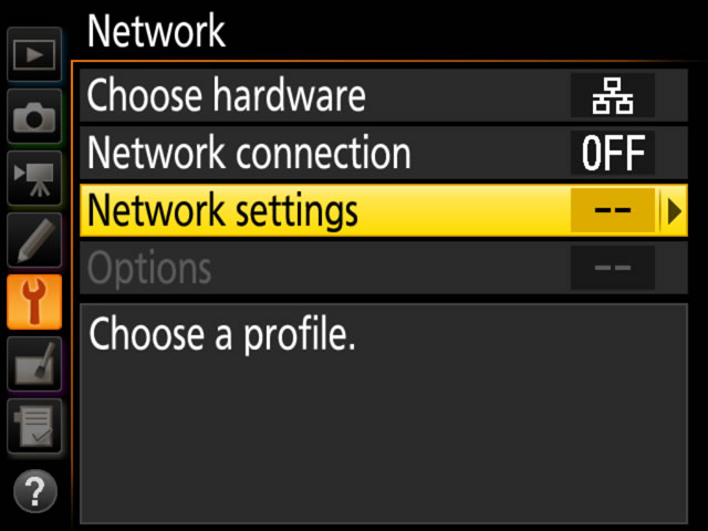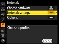 Highlight Network settings and press the multi selector right to view a list of network profiles.