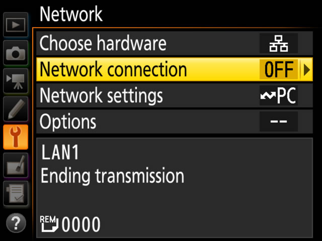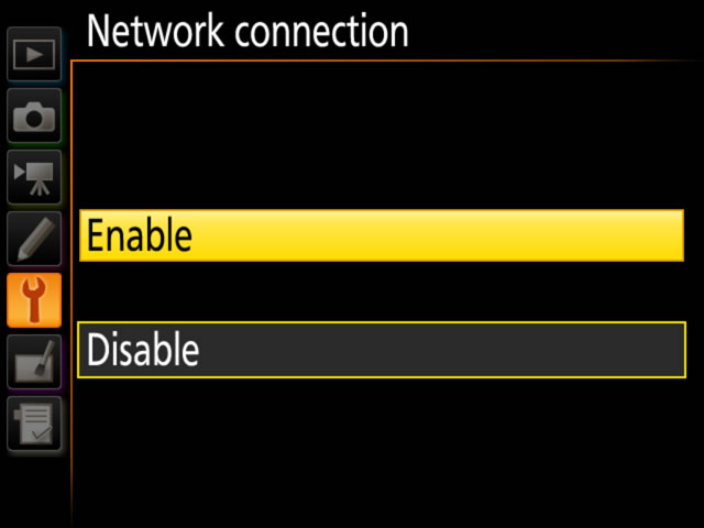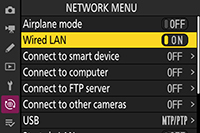 - Z9: Select ON for Wired LAN in the camera network menu.