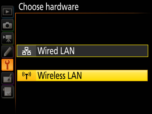 Select Wired LAN/WT > Choose hardware > Wireless LAN in the camera setup menu.
