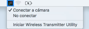- Cuando se instala Wireless Transmitter Utility, el icono de Wireless Transmitter Utility en la barra de menú se puede usar para finalizar la conexión a la cámara o iniciar Wireless Transmitter Utility. Las siguientes opciones solamente están disponibles al seleccionar Transferencia de imágenes como modo de operación: