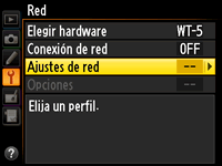 Seleccione Red > Ajustes de red en el menú de configuración de la cámara y siga las instrucciones en pantalla para crear un perfil de red. Para obtener información sobre la creación de perfiles Ethernet, consulte la Guía de red suministrada con la cámara. Para obtener información sobre el uso del WT-7 o WT-5, consulte la documentación suministrada con el dispositivo.