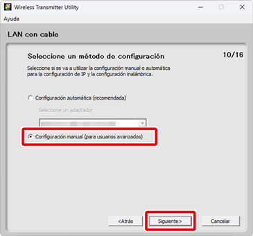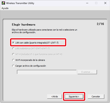 Seleccione LAN con cable (puerto integrado/UT-1/WT-7) y haga clic en Siguiente.