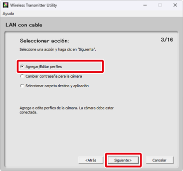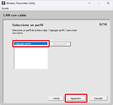 Para editar un perfil de red existente, selecciónelo y haga clic en Siguiente. Para eliminar un perfil existente, selecciónelo y haga clic en Eliminar perfil. Wireless Transmitter Utility no puede utilizarse para alterar perfiles que hayan sido protegidos usando la opción de la cámara Protección con contraseña. Seleccione Desactivada para Protección con contraseña antes de borrar o modificar perfiles.