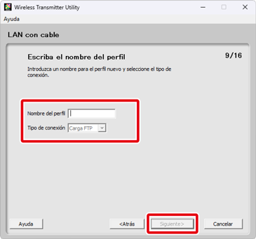 Ingrese un nombre de perfil de un máximo de 16 caracteres y seleccione el tipo de conexión entre Carga FTP, Transferencia de imágenes, Control de cámara o Servidor HTTP. Haga clic en Siguiente una vez finalizada la configuración.