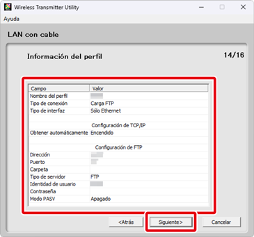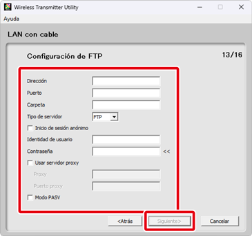 Los ajustes del servidor FTP solo están disponibles si Carga FTP es seleccionado en el paso 6. Al seleccionar otra opción, continúe con el paso 10. Después de ajustar la configuración, haga clic en Siguiente. Para obtener más información, consulte la tabla siguiente.