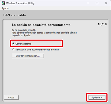 La configuración de Ethernet (LAN con cable) ha finalizado. Para más información sobre la conexión a la red desde la cámara, consulte “Conexión mediante perfiles creados en un ordenador”.