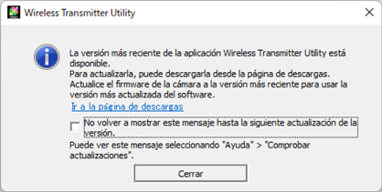 Dependiendo de su modelo de cámara, es posible que tenga que actualizar no solo el Connection Profile sino también Wireless Transmitter Utility. En dicho caso, aparecerá un cuadro de diálogo de notificación al iniciar la aplicación. También puede ver el cuadro de diálogo de notificación desde la opción Comprobar actualizaciones en el menú Ayuda.
