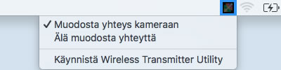 - Tietokone saattaa olla hidas tunnistamaan kameroita, joiden muistikortit sisältävät paljon kuvia. Tämän voi estää poistamalla muistikortit kamerasta, kun käytetään Wireless Transmitter Utility -hyötyohjelmaa.