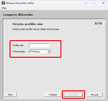 Kirjoita korkeintaan 16 merkkiä pitkä profiilin nimi ja valitse yhteystyyppi kohdasta FTP-lataus, Kuvan siirto, Kameran ohjaus tai HTTP-palvelin. Napsauta kohtaa Seuraava, kun asetukset ovat valmiit.