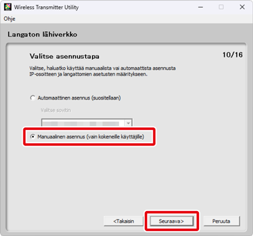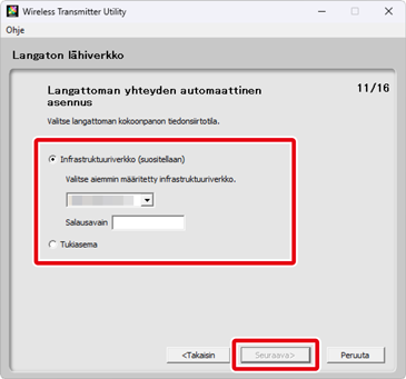 Jos valitsit asetuksen Automaattinen asennus (suositellaan) vaiheessa 7, langattoman lähiverkon asetukset säädetään automaattisesti. Valitse Infrastruktuuriverkko (suositellaan) tai Tukiasema ja napsauta kohtaa Seuraava siirtyäksesi vaiheeseen 10.